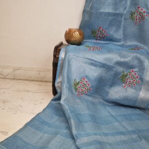 Linen Tissue Saree – Summer Blue – Embroidery