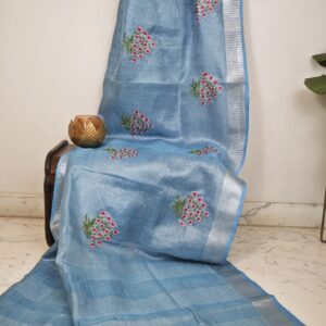 Linen Tissue Saree – Summer Blue – Embroidery