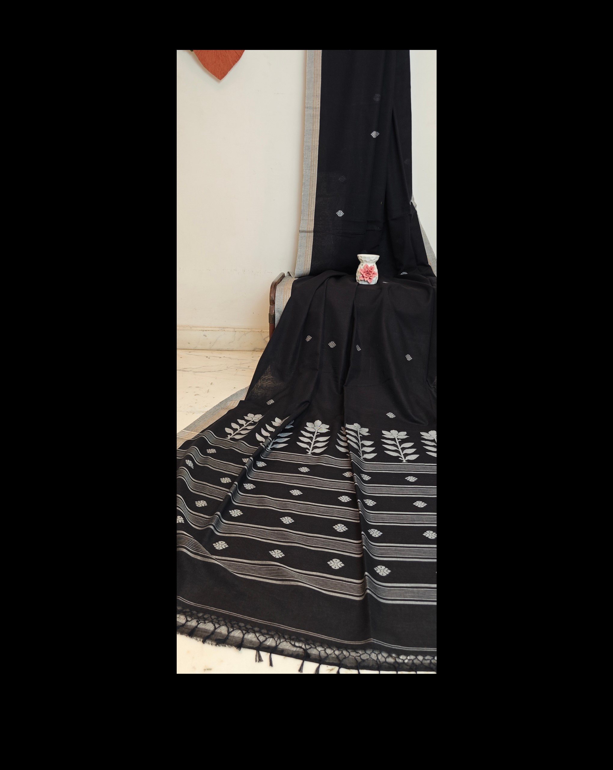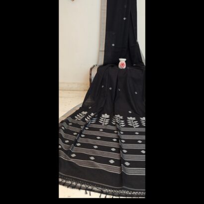 Handloom Jamdani Saree -Excquisite black Lotus motifs