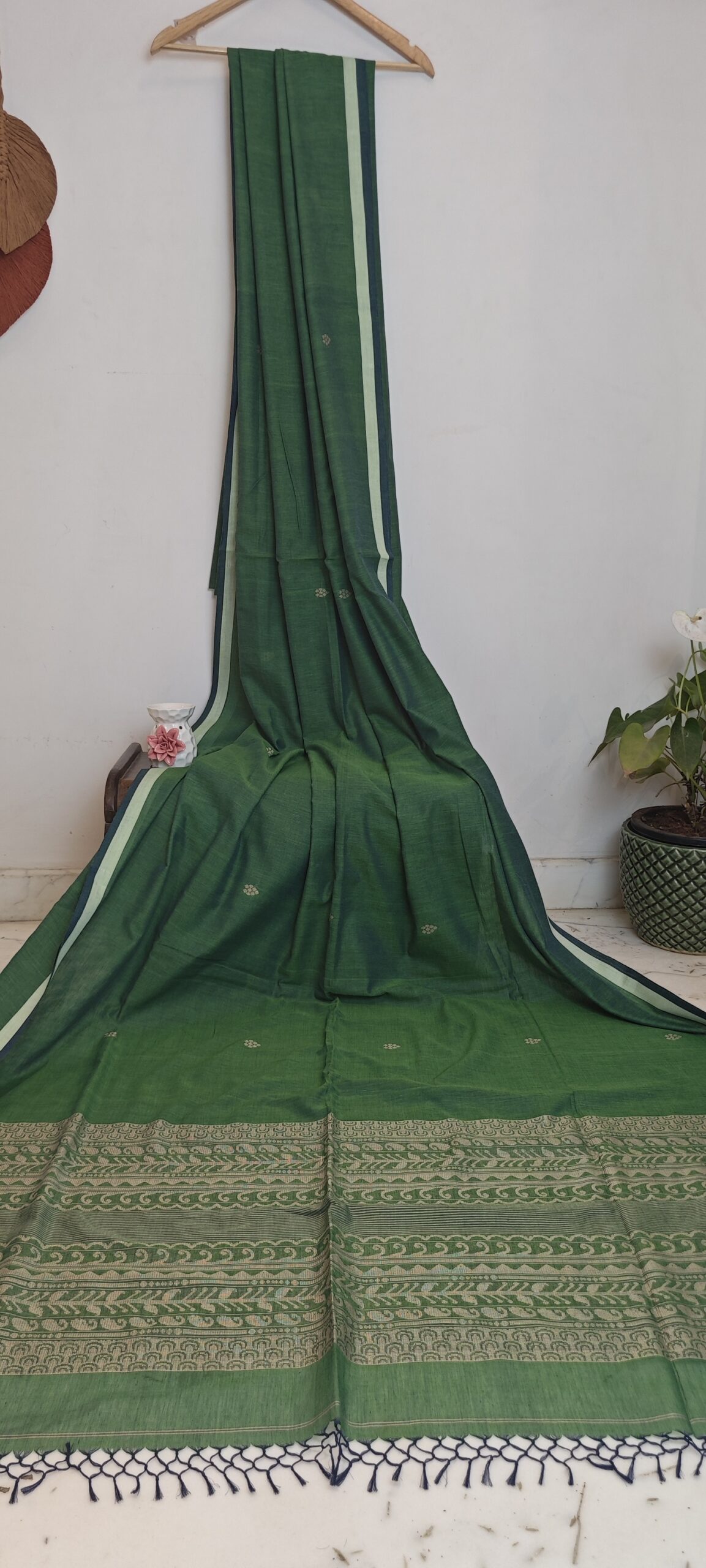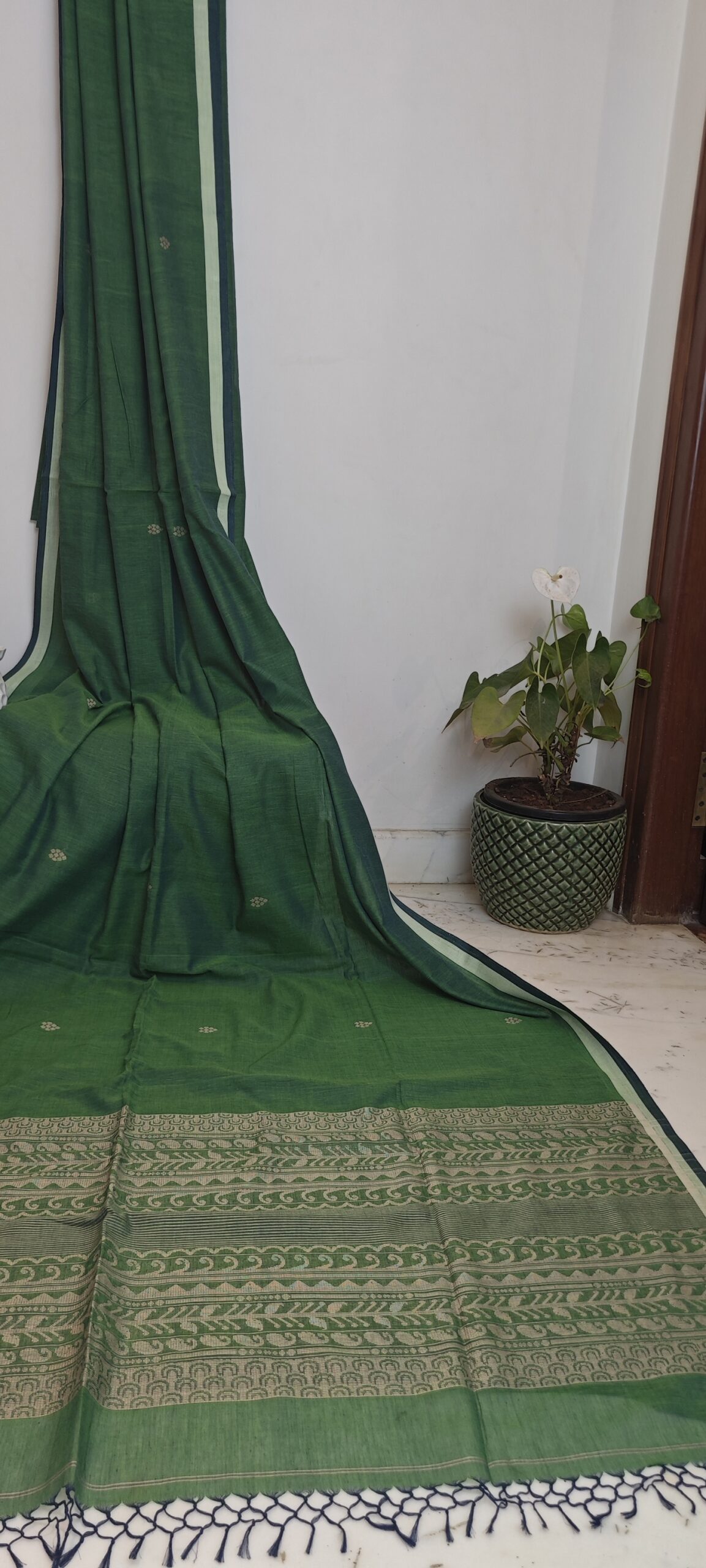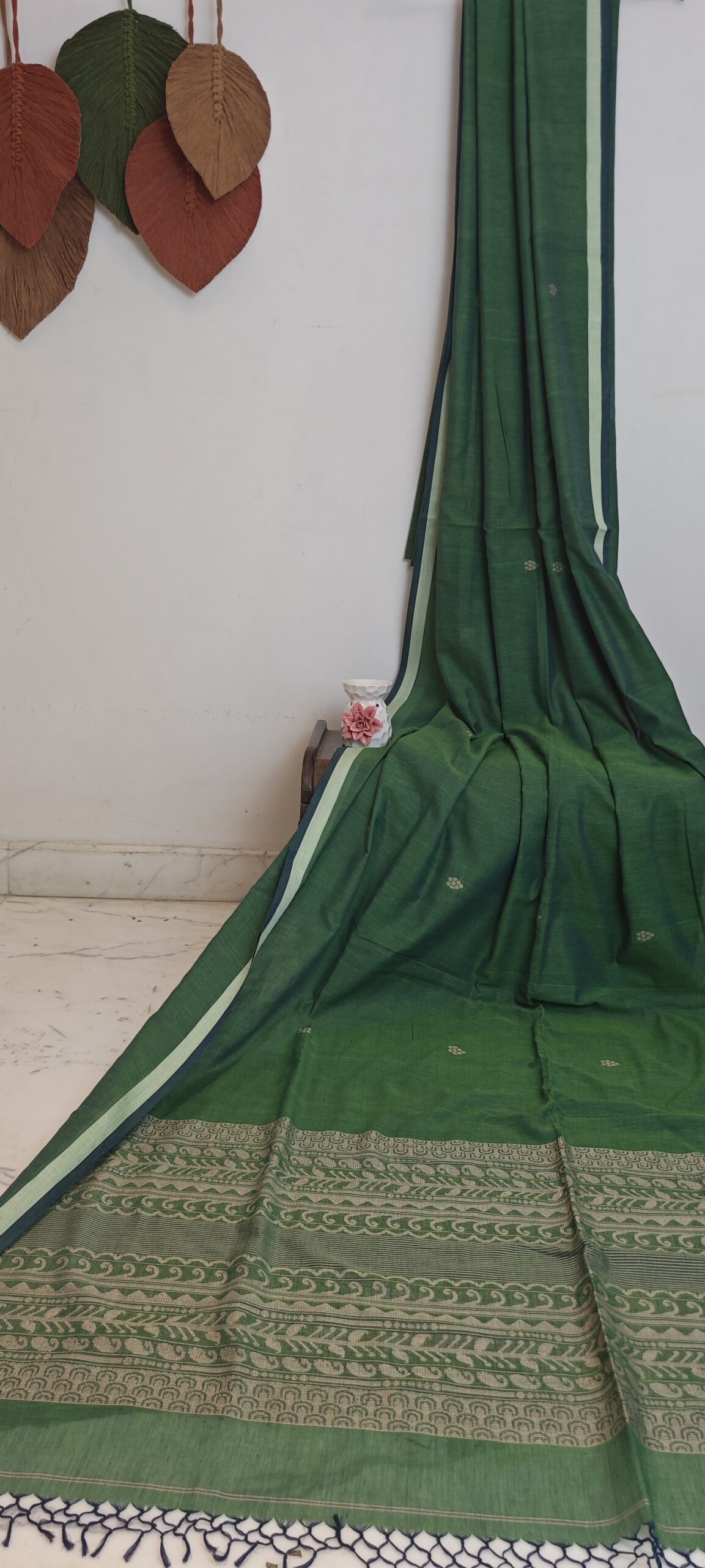 The true treasures of Handloom Saree from West Bengal. They are famous in producing  heritage handloom products like Jamdani, tangail and santpuri . This saree is designer inspired and along with blouse material.